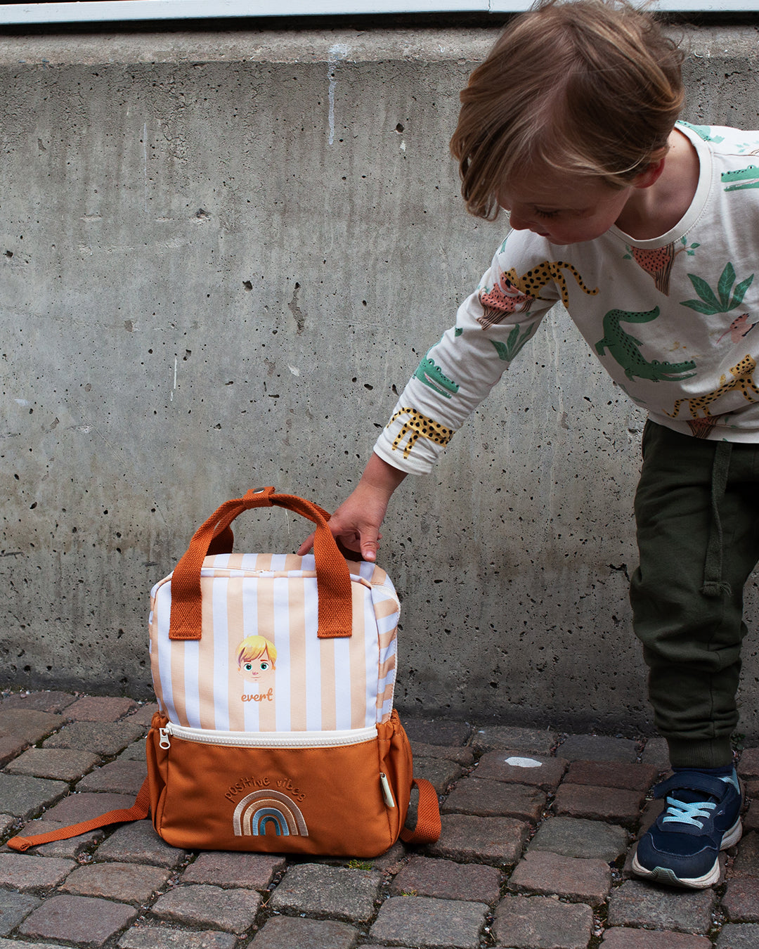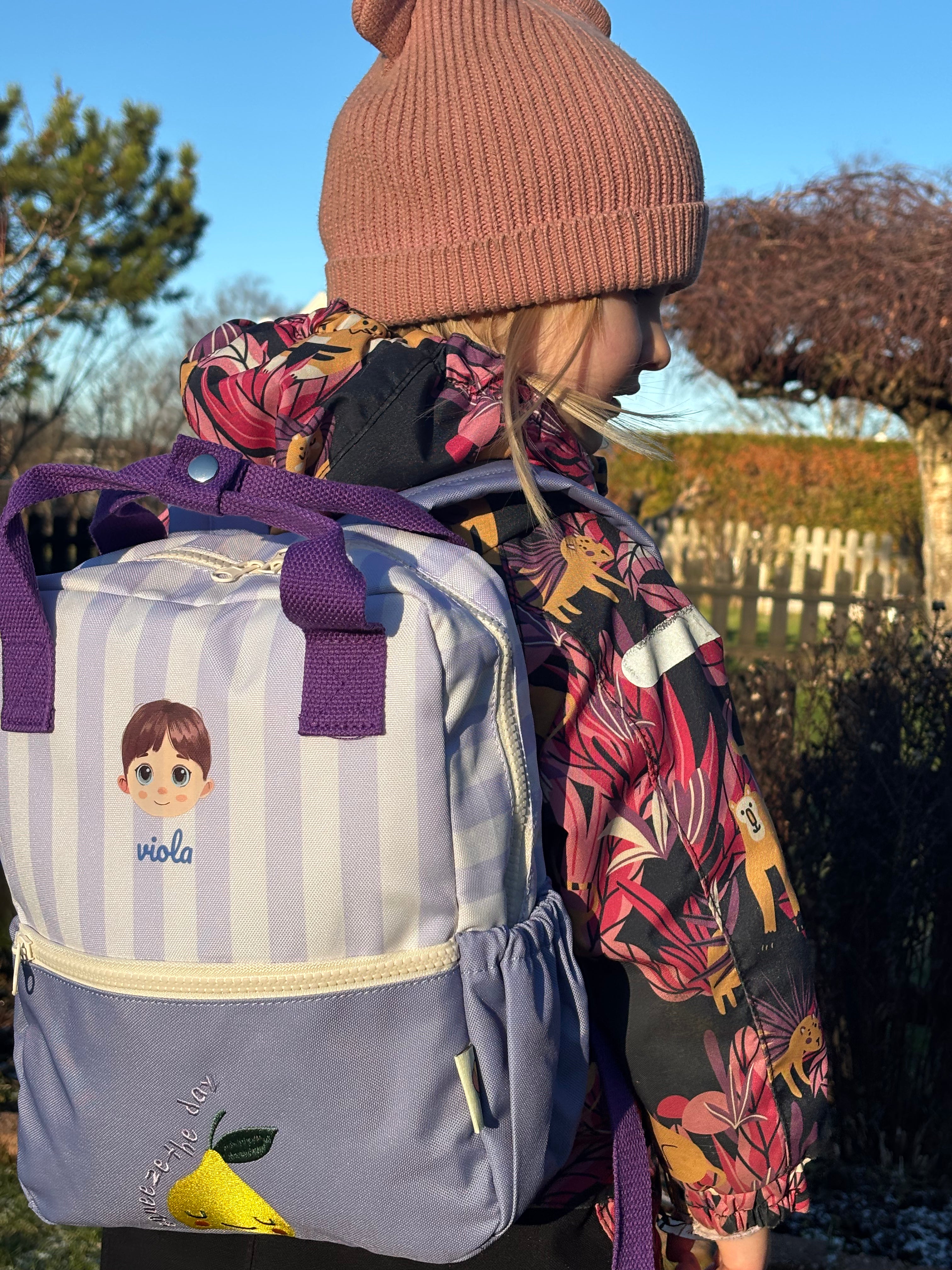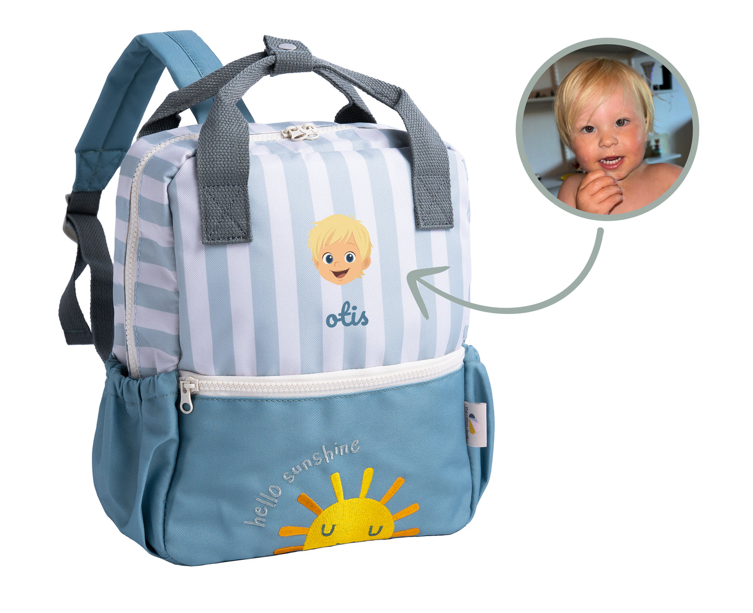 Varje ryggsäck blir helt personlig – vi omvandlar din bild till en liten tecknad figur och trycker den tillsammans med barnets namn. Ingen annan har samma väska.